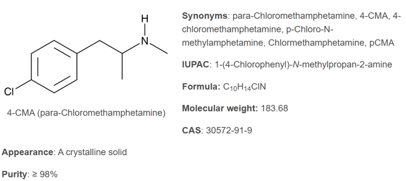 • Chemical Name: 4-CMA (para-Chloromethamphetamine)