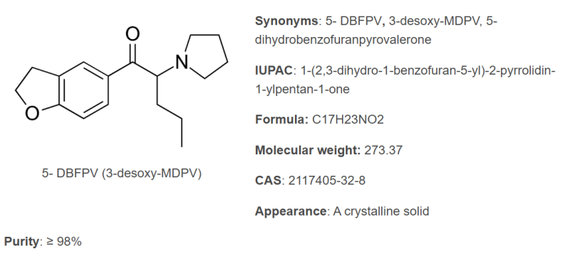 Looking to buy 5-DBFPV online? Our store offers high-purity 5-DBFPV (3-desoxy-MDPV / 5-dihydrobenzofuranpyrovalerone), a synthetic stimulant from the cathinone class. As a close analogue of MDPV, this compound is attracting interest within the research community for its unique structural variation and stimulating pharmacological profile.